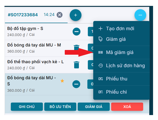 - Nhập Mã giảm giá cho đơn hàng: bấm vào nút ba chấm (…) ở góc trên đơn hàng, chọn Mã giảm giá.