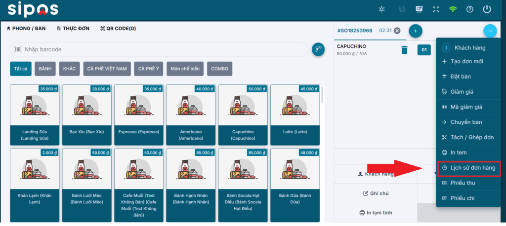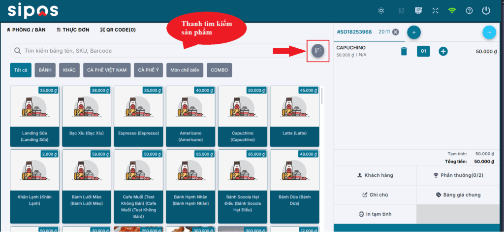 Thông tin thêm: nếu bên phải đang là đơn hàng trống thì bạn có thể nhấn trực tiếp vào sản phẩm để tạo đơn hàng mới.