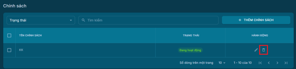 Tại chính sách công nợ bấm vào biểu tượng sọt rác để xóa chính sách công nợ