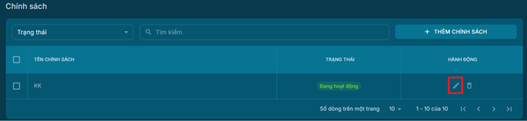 Tại chính sách công nợ bấm vào biểu tượng hình cây bút để chỉnh sửa chính sách công nợ, các bước chỉnh sửa như thêm chính sách.