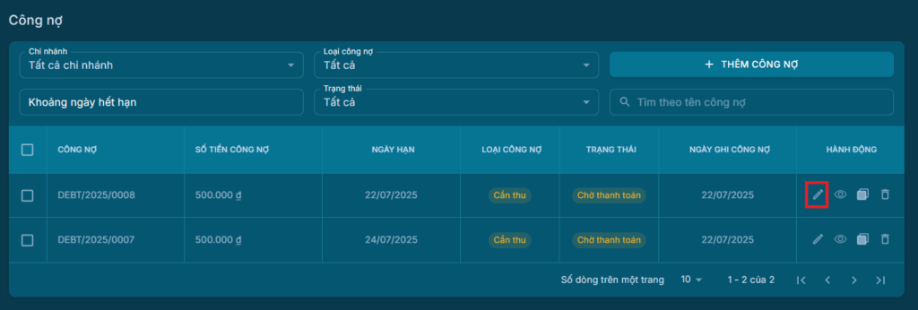 Tại công nợ bấm vào biểu tượng hình cây bút để chỉnh sửa công nợ, các bước chỉnh sửa như thêm công nợ.