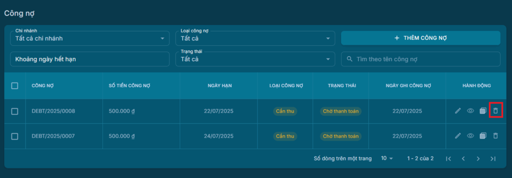 Tại công nợ bấm vào biểu tượng hình sọt rác để xóa công nợ