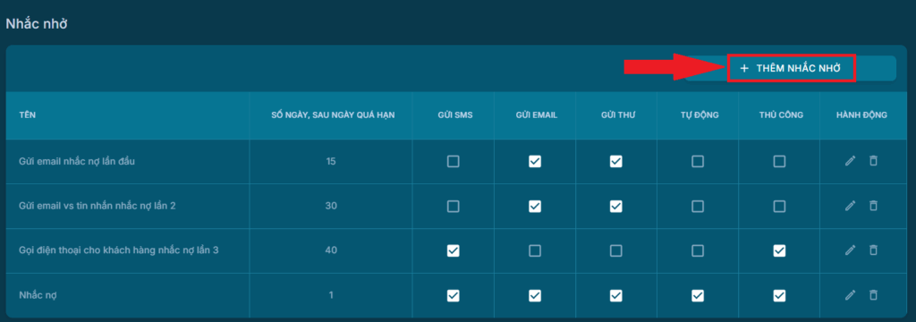 Tại nhắc nhở công nợ => chọn Thêm nhắc nhở