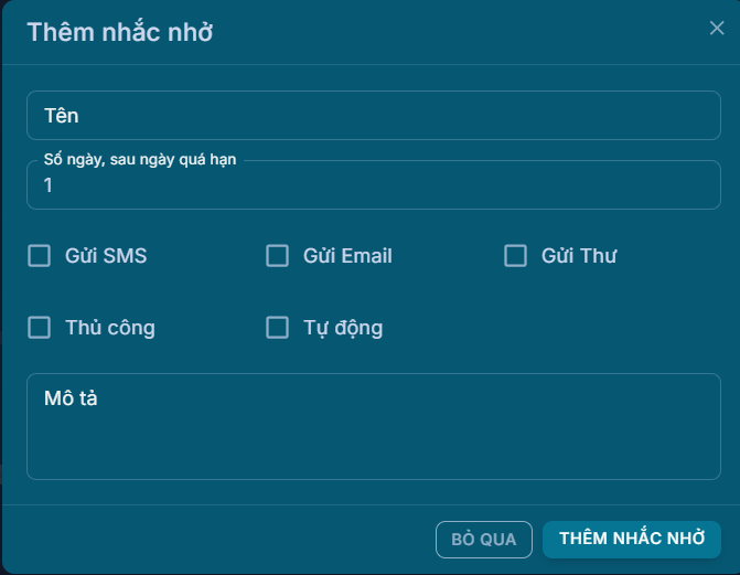 - Gửi Thư: nếu tick chọn, hệ thống sẽ gửi thư giấy (nếu có dịch vụ hỗ trợ) hoặc đánh dấu để nhân viên gửi thư tay nhắc công nợ theo lịch