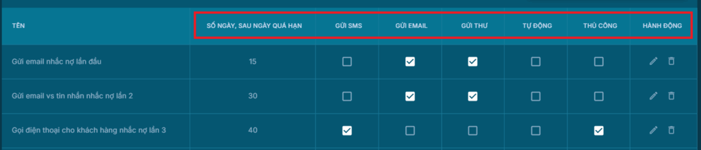 - Tự động: Nếu tick chọn, hệ thống sẽ tự động thực hiện gửi SMS, email hoặc thư theo lịch