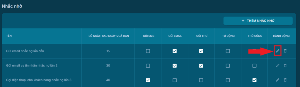 Tại công nợ bấm vào biểu tượng hình cây bút để chỉnh sửa nhắc nhở công nợ, các bước chỉnh sửa giống như thêm nhắc nhở công nợ.