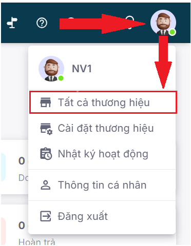 Đối với tài khoản đã có Thương hiệu hoặc đang làm việc (và có tài khoản nhân viên) tại Thương hiệu bất kỳ: bấm vào tài khoản, chọn Tất cả thương hiệu.