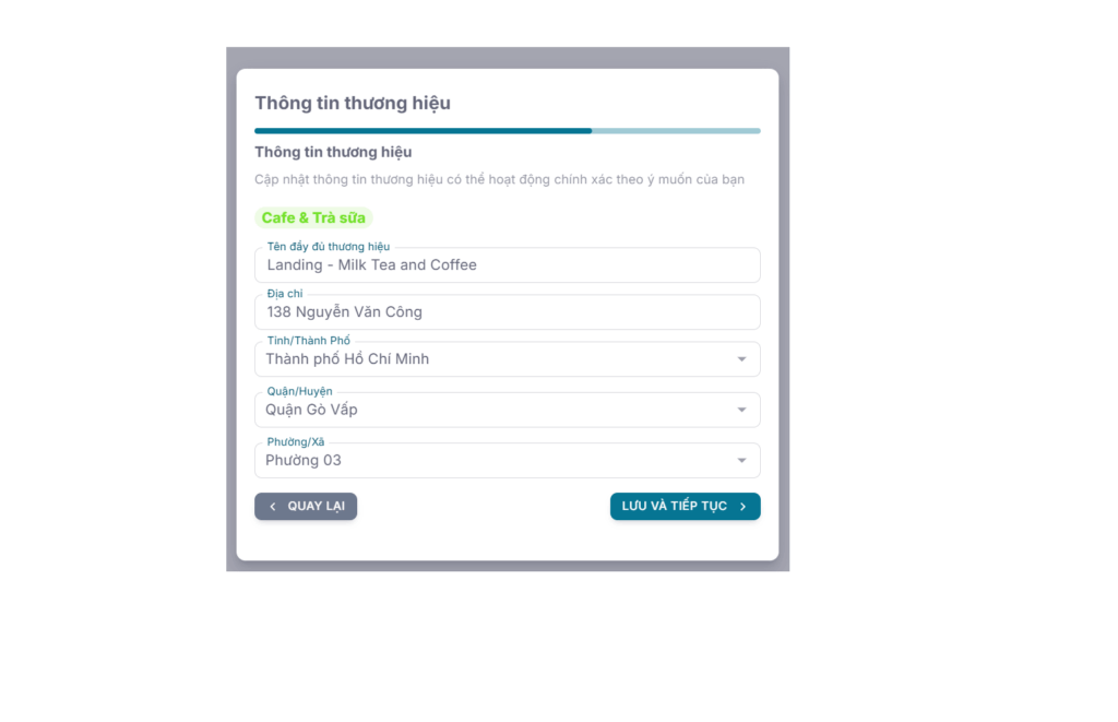 Bước 5: Bấm nút LƯU VÀ TIẾP TỤC để lưu thông tin và tạo Thương hiệu, cửa hàng.