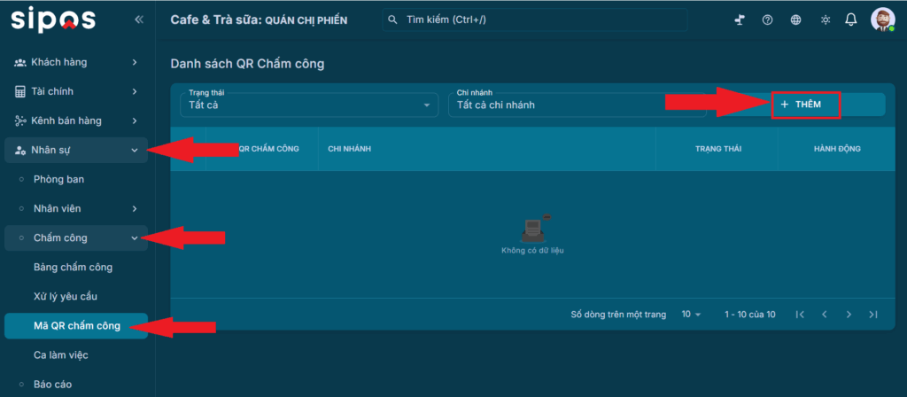 Vào danh sách menu bên trái chọn Nhân sự => chọn Chấm công => chọn Mã QR chấm công => chọn Thêm