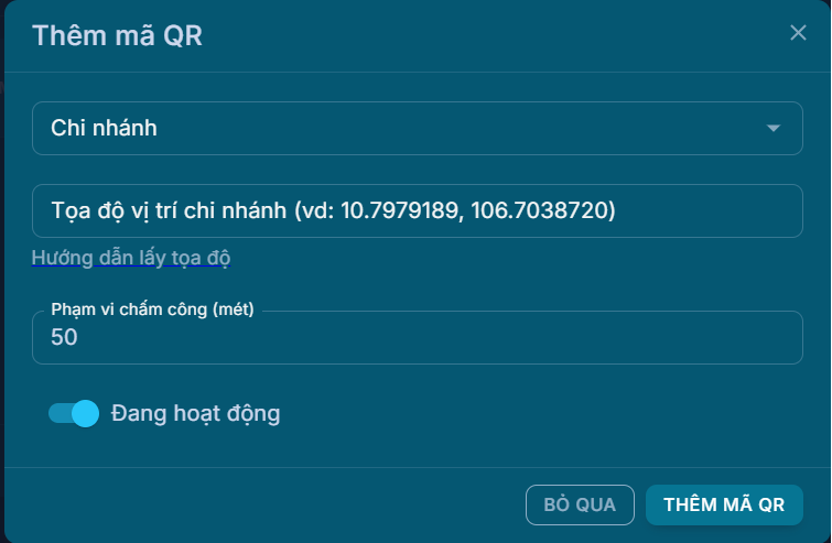 Sau đó nhập tọa độ vị trí chi nhánh (tham khảo thêm ở mục hướng dẫn cách lấy toạ độ chi nhánh trên bản đồ)