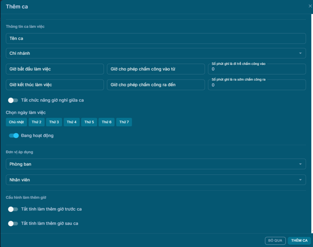 - Phòng ban: chọn phòng ban áp dụng cho ca làm việc