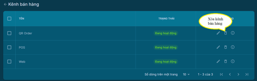 Tại Danh sách Kênh bán hàng, bấm icon hình sọt rác để xóa. Sau khi xóa, vẫn có thể thêm lại nhờ nút Thêm Kênh bán hàng.
