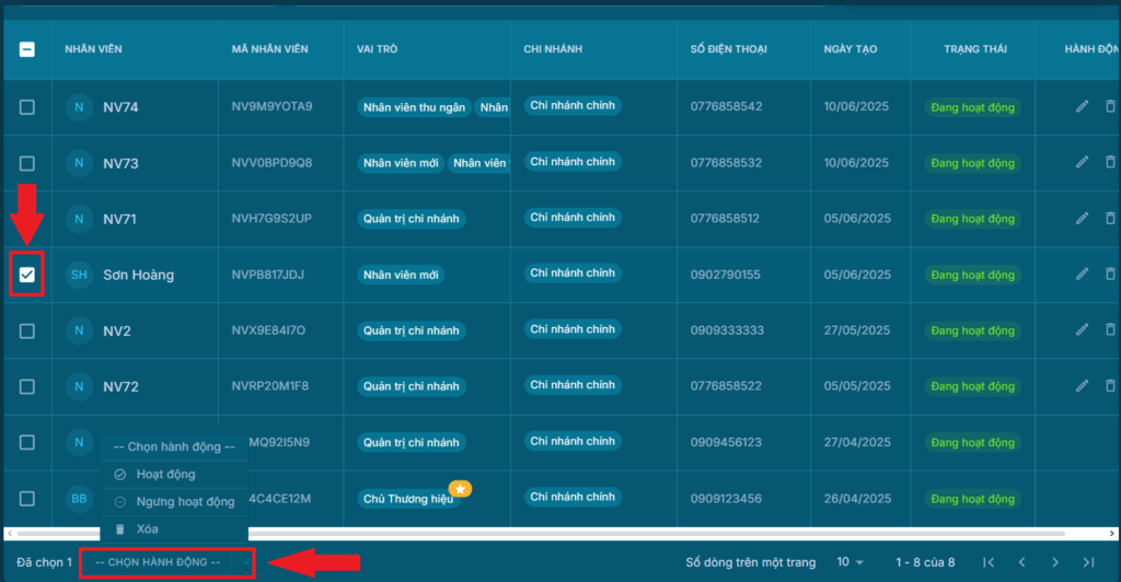 Tại danh sách nhân viên, nhấn chọn tick vào một nhân viên bất kì bạn muốn thao tác sau đó tại góc dưới bên tay trái trang danh sách nhân viên sẽ có mục Hành động