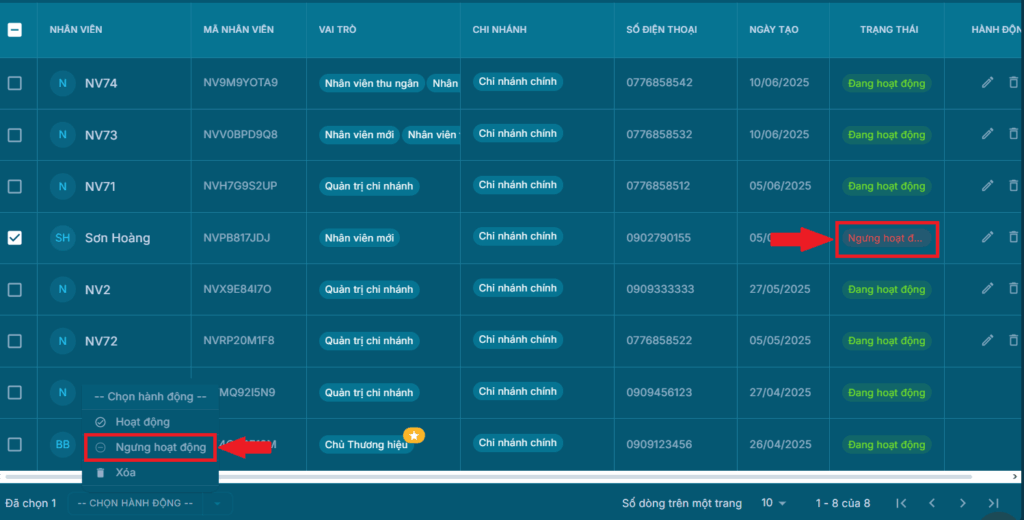 Bạn nhấp chọn vào mục Hành động sau đó chọn tiếp vào Ngưng hoạt động, nhân viên được bạn chọn sẽ tự động hiện đỏ lên trên danh sách báo hiệu nhân viên đó đã ngưng hoạt động