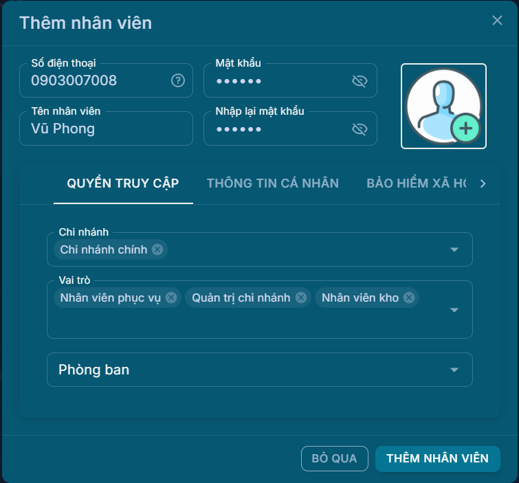 - Quyền truy cập: gồm Chi nhánh (chi nhánh phụ trách của Nhân viên), Vai trò (quyền hạn của Nhân viên tại cửa hàng) và Phòng ban (phòng ban mà nhân viên làm việc). Có thể chọn nhiều Chi nhánh, Vai trò cùng lúc