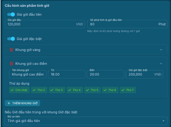 Giá giờ đặc biệt: Nhấn bật/tắt tính giá giờ đặc biệt. Có thể cầu hình 1 hoặc nhiều khung giờ và không được trùng lắp khung giờ