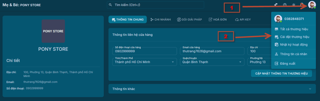 Để chỉnh sửa thông tin Cửa hàng, tại góc phải màn hình, bấm chọn Icon như hình đính kèm (B1) => Cài đặt thương hiệu (B2)